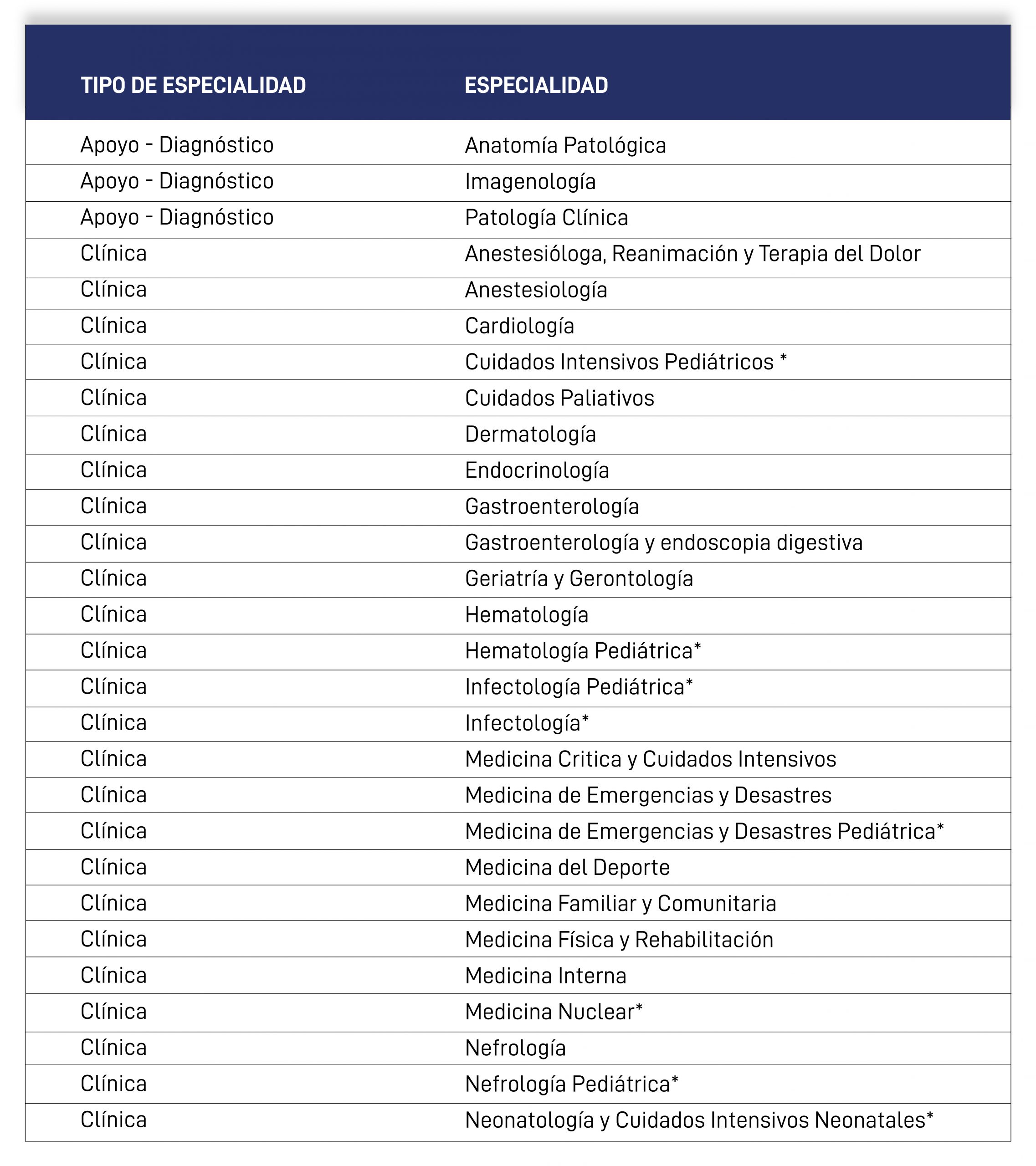 Los profesionales que deseen participar en el proceso de selección para Técnico Evaluador 2, Servidor Público 14, de preferencia, deben tener el siguiente perfil específico profesional y académico, de acuerdo con los criterios y estándares de la Adaptación del Modelo Genérico para la evaluación del entorno de aprendizaje de los programas de posgrado para el campo de Medicina. La formación académica del postulante se puede enmarcar en cualquiera de las siguientes especialidades médicas:  (clic en la imagen)