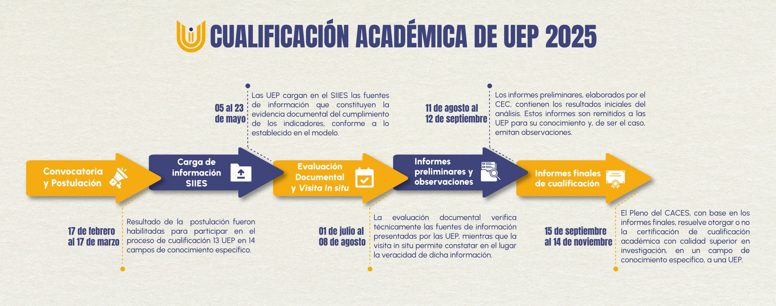 La cualificación académica es un reconocimiento otorgado por el CACES a las UEP que demuestran calidad superior en investigación en uno o más campos del conocimiento. Este reconocimiento es el resultado de una evaluación externa voluntaria, sin fines de acreditación, basada en la misión, visión, fines, objetivos, así como en las capacidades, fortalezas y dominios académicos e institucionales de cada UEP.